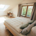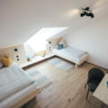 -1 Schlafzimmer mit fexiblem Bett, entweder Doppelbett, oder zwei Einzelbetten im Obergeschoss