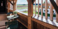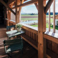 Direkt vom Wohnraum und von einem der Schlafzimmer gelangt ihr auf eine Loggia der besonderen Art. Da wir mit unserer neuen Wohnkiste vom altehrwürdigen Gebälk abrücken, entstehen unerwartete Zwischenräume. Öffnet die großen Terrassentüren und macht den Wohnraum zum Aussenraum. Hier seid ihr im Inneren der Stadelfassade und doch draussen. Völlig privat und uneingesehen könnt ihr es Euch z.B. in unserer Lounge Ecke gemütlich machen und den Blick über den Teich Richtung Felder, Wiesen, Wälder und Berge schweifen lassen.