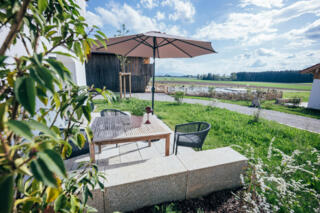 An der sonnengewärmten Westseite unseres altehrwürdigen Stadels liegt die Terrasse, die ihr direkt vom Wohnraum aus betreten könnt. Von hier aus habt ihr einen traumhaften Blick über unseren Schwimmteich in die Ferne bis zur Chiemgauer Alpenkette. Lasst Euch nieder und genießt.